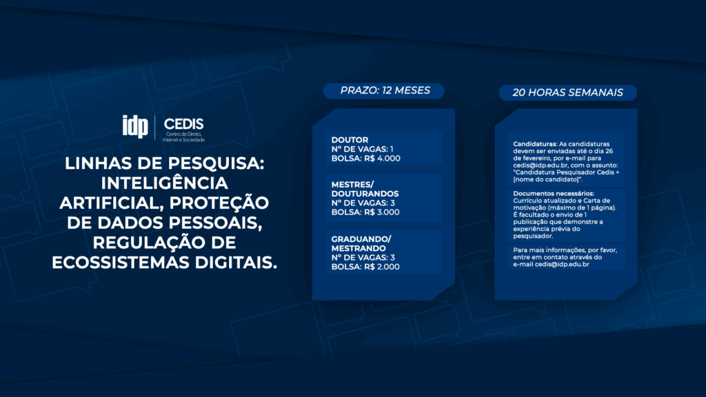 O Centro de Direito, Internet e Sociedade (CEDIS), do Instituto Brasileiro de Ensino, Desenvolvimento e Pesquisa (IDP), abriu edital para a seleção de pesquisadores para integrar sua equipe de estudos sobre inteligência artificial, proteção de dados pessoais e regulação de ecossistemas digitais. As inscrições vão até o dia 26 de fevereiro. Vagas e bolsas O edital […]