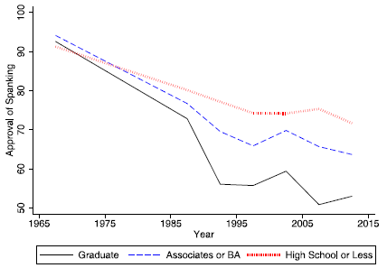 Também foi observado que o aumento na educação dos pais está associado a uma menor propensão de ser autoritário e um aumento na propensão de ser autoritativo. A Figura 1 inclusive demonstra que há um maior envolvimento dos pais na educação e uma menor educação na aprovação de castigos corporais quando os pais são mais educados, enquanto pais com menor escolaridade são mais propensos a recorrer a métodos autoritários.