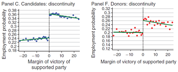Os resultados mostram que os apoiadores do partido vencedor são 10,5 pontos percentuais mais prováveis de ter um emprego no setor público no período pós-eleitoral: uma probabilidade 47% maior do que os doadores do partido em segundo. Onde as maiores probabilidades de emprego se traduzem em aumento significativos no total de ganhos, 34% para candidatos e 10% para doadores. Como pode ser visto na Figura 1, há um salto descontínuo na probabilidade de emprego no setor público, tanto para candidatos quando para doadores.