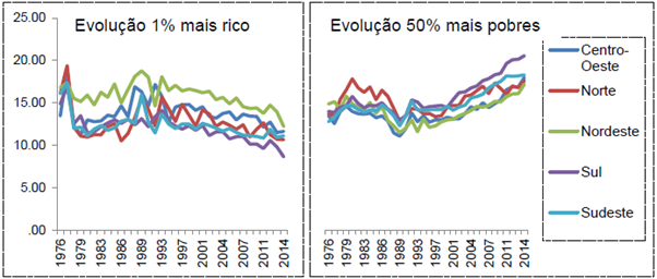.No final da década de 1970 e início de 1980, fica evidente a disparidade entre o grau de concentração de renda entre os 1% mais ricos e os 50% mais pobres. Na qual a parcela apropriada pelos mais ricos nesse período era maior ou igual à apropriada pelos mais pobres para praticamente todo o Brasil, em que a diferença maior foi em 1977 para a região Centro-Oeste. Assim como os indicadores de desigualdade, a partir do meio dos anos noventa, a situação apresenta uma melhora, na qual a região Sul em 2014 atingiu o menor nível de apropriação pelo 1% mais rico.