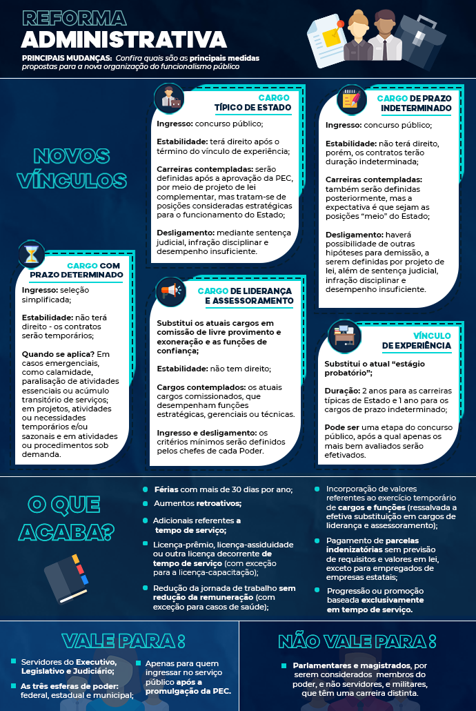 A proposta enviada ao Congresso aborda, principalmente, a contratação, a remuneração e o desligamento de pessoal. As novas medidas, entretanto, valem apenas para quem ingressar no serviço público após a aprovação da emenda.