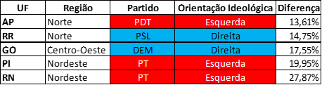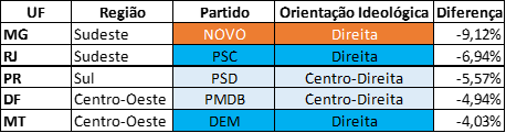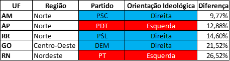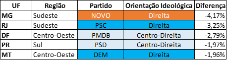 Analisando os dados apresentados, percebe-se que há uma forte heterogeneidade regional. Porém, quando analisa-se o perfil dos governadores, há um certo padrão ideológico. Entre os estados que mais cortaram gastos com pessoal, se destacam os com governadores com perfil ideológico mais alinhados à direita.