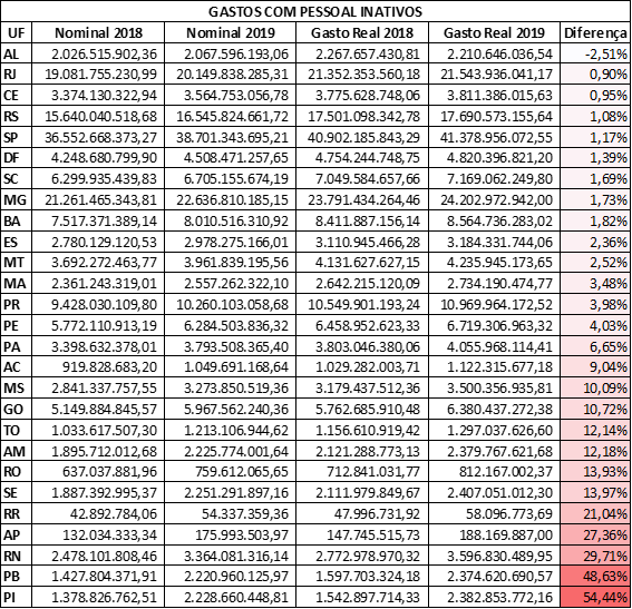 Os Estados apresentaram um crescimento de, em média, impressionantes 10,91% nos gastos com inativos de um ano para o outro.