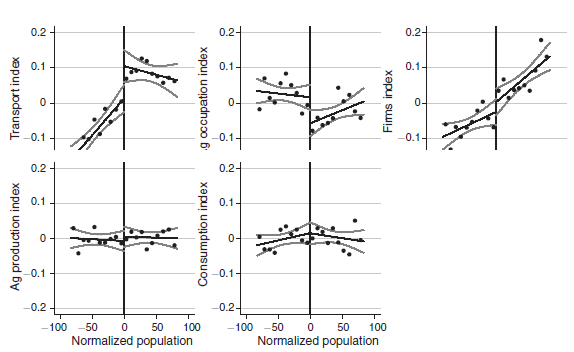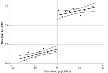 Para a realização da pesquisa, utilizou-se dois limites de população nos vilarejos: 500 e 1.000. Os vilarejos que excedem esses limites, tinham 22 pontos percentuais a mais de probabilidade de receber uma estrada pavimentada, assim, os autores superaram o obstáculo da correlação entre a construção de estradas e as características econômicas e políticas da localidade, permitindo estimar o impacto causal através do método de regressão descontínua (rd).