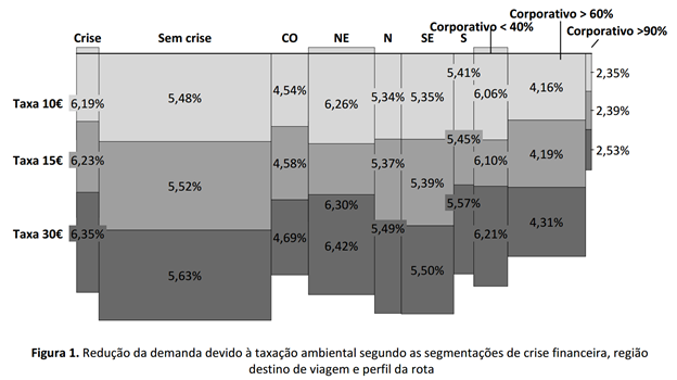 Os autores estimaram taxas diferentes, em diferentes setores e regiões. Todas as taxas aplicadas, nos valores de 10, 15 e de 30 euros obtiveram impactos negativos na demanda. A principal região afetada é a Nordeste, em função de seu setor aéreo ser fortemente influenciado pelo turismo, cuja demanda sofre mais com o aumento nos preços. Em outras palavras, o custo econômico e social foi maior para essa região.