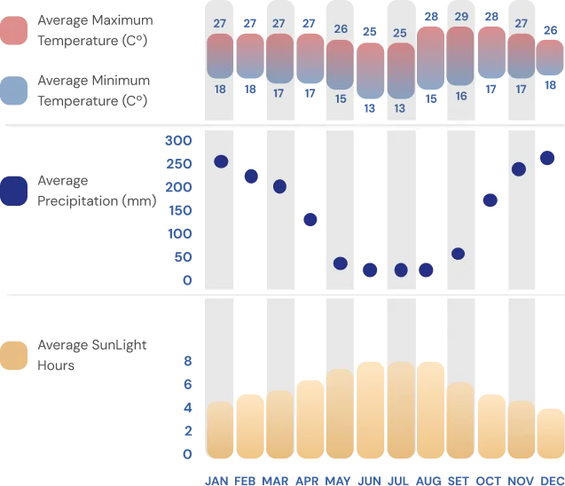 The climate in Brasília is tropical and offers warm to hot temperatures. Between October and April there is a lot of rain in Brasília. From May to September, the amount of precipitation is much lower and the weather is mostly warm to hot. Only at night can it get a little cooler sometimes. The maximum amount of daily sunlight also awaits you during the dry season.