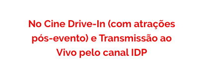 A experiência presencial acontecerá no patrimônio cultural mais tradicional de Brasília, o Cine Drive In. Haverá retirada de ingressos e exibição GRATUITA de dois filmes para os participantes do Open Day Graduação IDP.As vagas são limitadas! Mas caso você não possa ou não consiga garantir o seu lugar, poderá estar presente conosco ao vivo pelo canal IDP.
